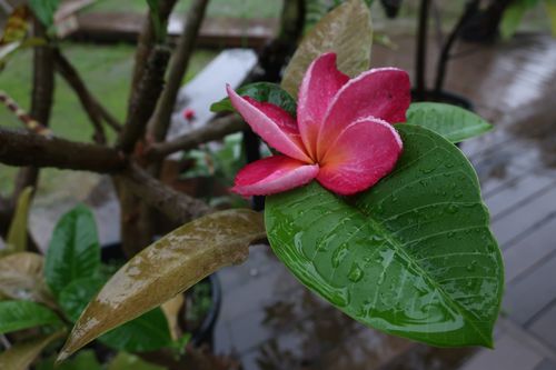 「プルメリア」です!ハワイでは神聖な花として、レイ(頭や首にかける装飾品)や髪飾りに使われるそうです。