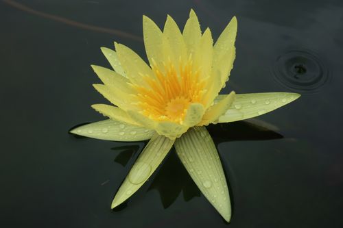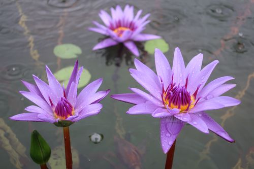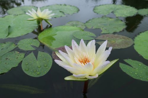 花についた露や水面に跳ね返る雨粒が花の美しさを引き立てます。