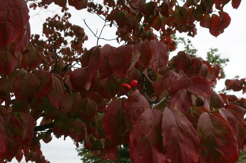 真っ赤な実と渋めの赤い葉っぱがとても鮮やかです。