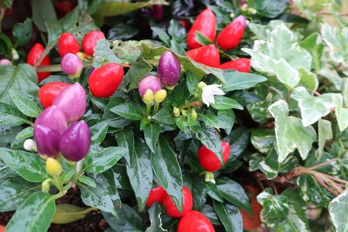 園内の寄せ植えに様々な種類のトウガラシが植えられています。