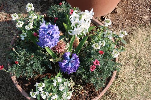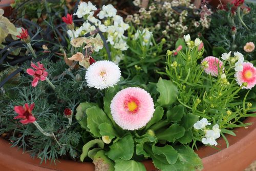 寄せ鉢もデイジーなど、春の花がメインのものが増えています。