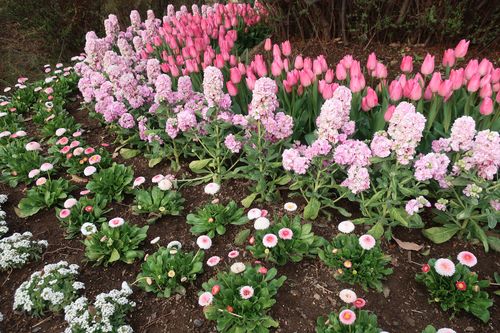 ミニバラやヒヤシンスなどボリュームのある花が園内を彩ります。