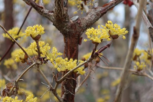 こちらはサンシュユ。秋に赤い実をつける木ですが、花は黄色で明るい印象です。