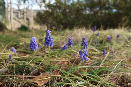 ちょこんと紫の小さな花がブドウみたいに密集して咲いています。小さくて可愛らしいですね。ムスカリは寄せ植えなどにも使用されます。