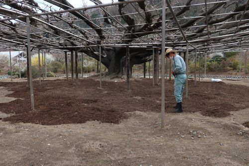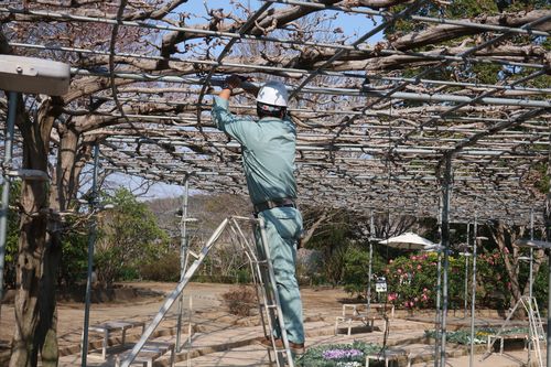 こちらは藤のライトアップに向けて照明の設置を行っている様子です。