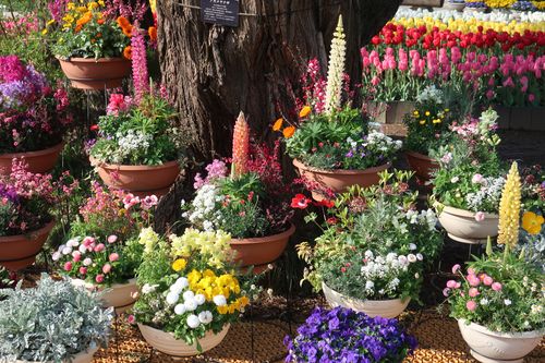 アカメヤナギの下にはカラフルな寄せ鉢がたくさん!