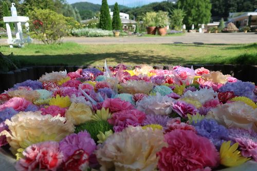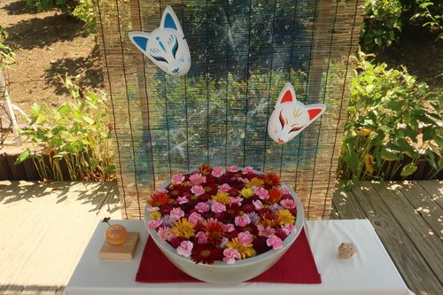 夏の花手水は園内南側の水路付近であと3日、8月29日までお楽しみ頂けます。