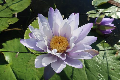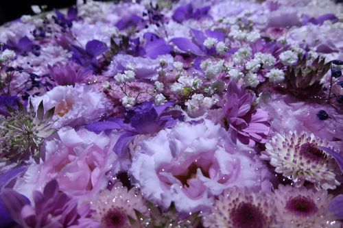 「奇蹟の大藤」藤色の花々でまとめました。大藤の世界を花手水でもお楽しみ頂ければ。