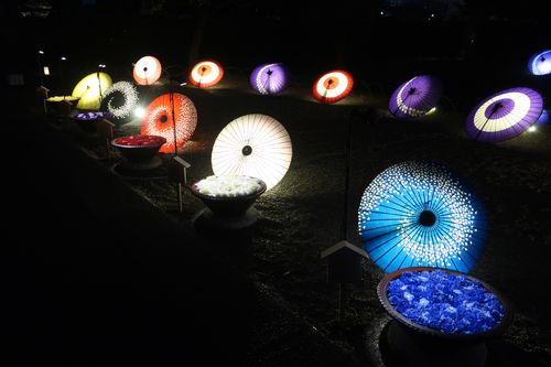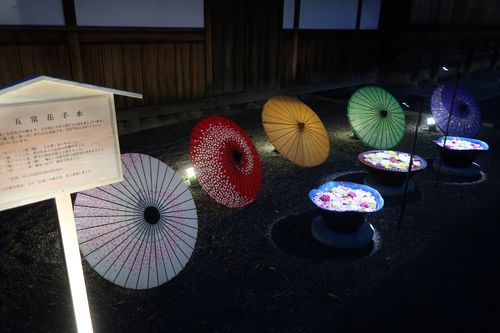 まずは「足利灯り物語2021秋」という事で足利学校にフラワーパーク監修で和傘38本と花手水12鉢を展示し、ライトアップを行っております!