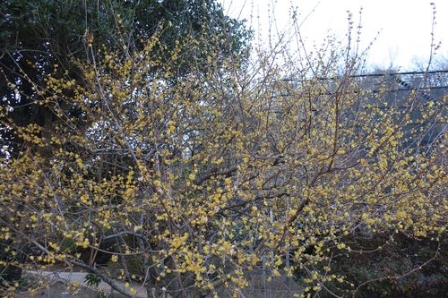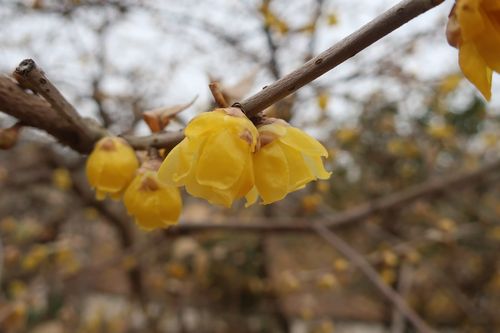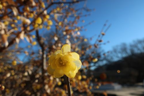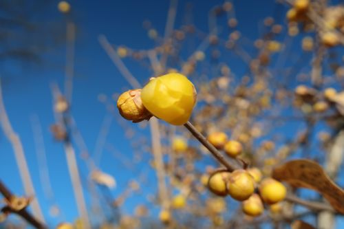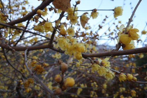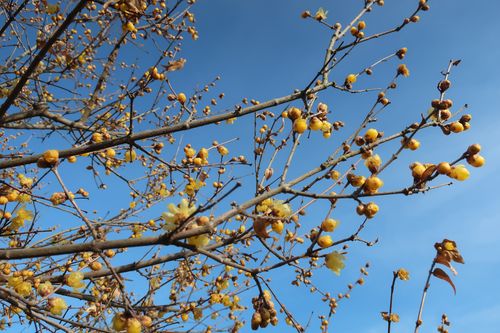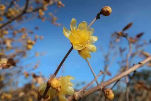 まずは蝋梅(ロウバイ)です。花びらがロウ細工の様に美しいことから、この名前がついたとされています。