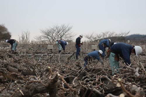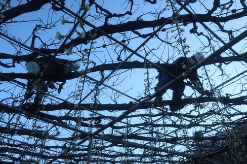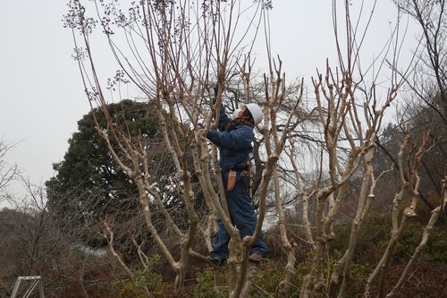 こちらはお馴染みの光景、藤の冬剪定。今日は大長藤を行っていました。下から見るとあまり分かりませんが、上からだと幹のゴツゴツした感じがよくわかります。ここからあの麗しい藤の花房が垂れ下がってくると思うと非常に興奮します!!