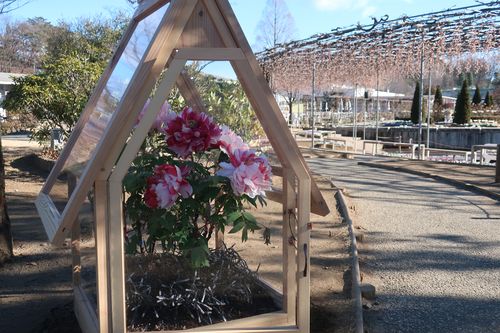 小屋の中に入った冬咲きボタンや寄せ植えを見て楽しむことが出来ます。