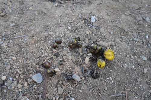 ロウバイは全体的に見ると蕾と花弁が混ざり合いとても
