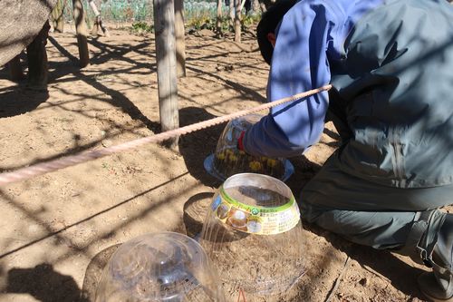 寒肥の穴掘りの際、福寿草に土がかからないように