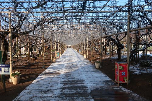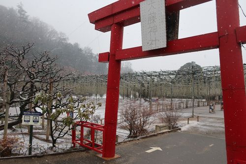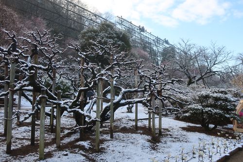 ほとんど雪が降らない地域で、薄っすら雪化粧した園内を歩く…