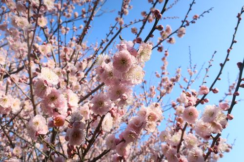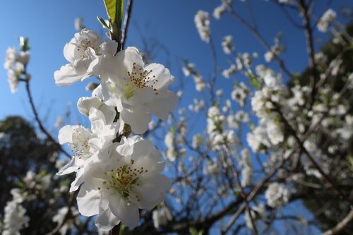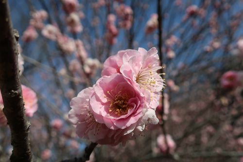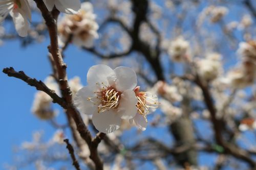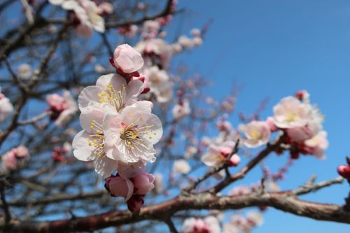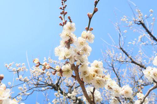 空を背景に春らしいウメの写真を撮ってみてはいかがでしょうか。ウメは園内の山側を中心に見ることができます。