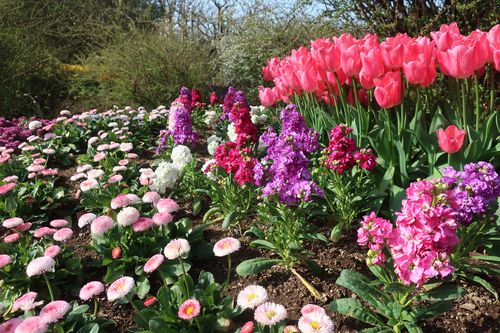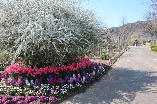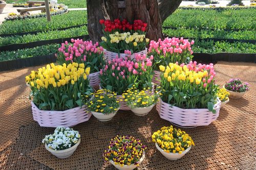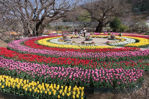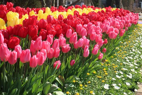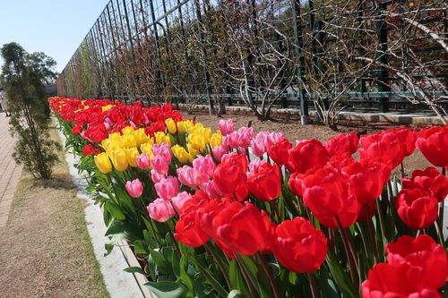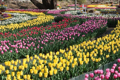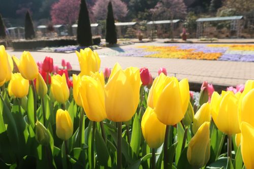 正面ゲートやフラワーステージでは満開のチューリップがお楽しみ頂けます。園内では赤・白・黄色・ピンクのお花が中心ですが、4月以降はローズガーデンで変わり咲きのものもお楽しみ頂けます。