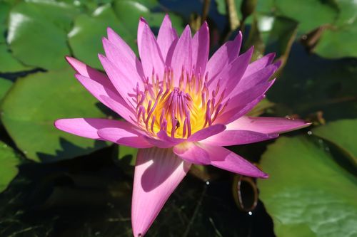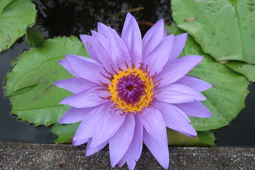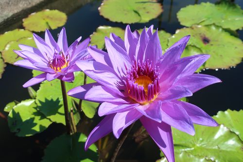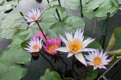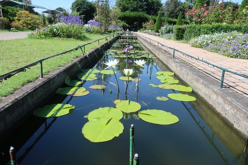 フラワーステージの水路に並ぶ色とりどりのスイレン…
