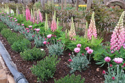 手前から、【アレナリア・モンタナ】【ローダンセマム】【ルピナス】の花壇です。