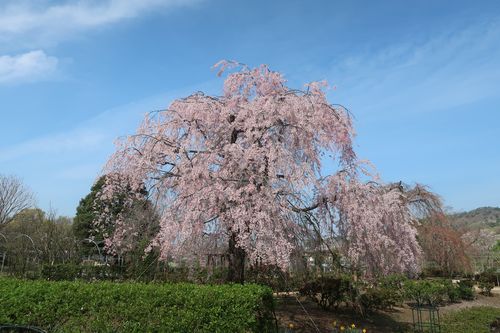 ソメイヨシノとしだれ桜です。青空に映えますね。ピークは過ぎましたが、散りゆく桜も