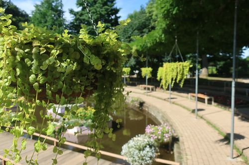 ↓フラワーステージ付近の藤棚に吊るされたリシマキア。