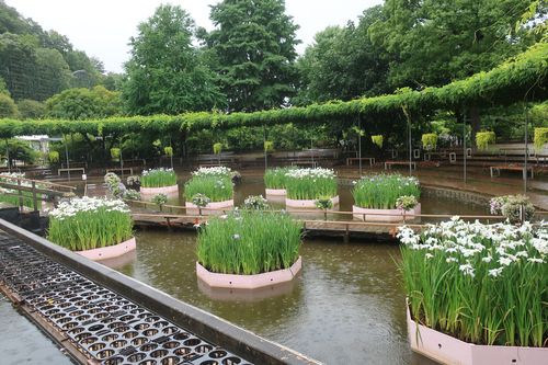 水に浮いてるトレイに花菖蒲を並べていきます。
