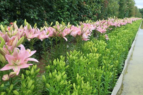 後ろから今咲いているピンク、白、ミックスの順で並んでいます。