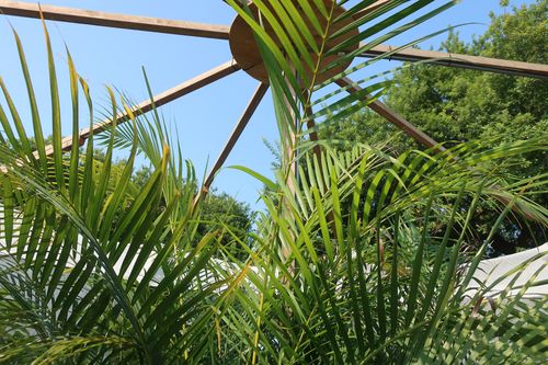 ↓天井部分とヤシの葉、青空を映した一枚。