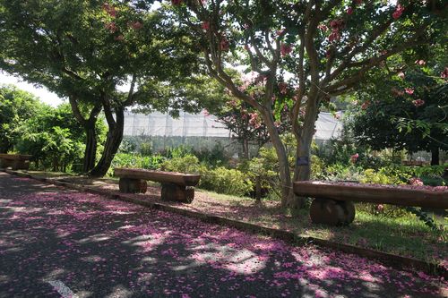 上を見ても綺麗ですが、下もなかなか素敵です。サルスベリの花が落ちてピンク色の絨毯が