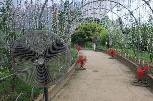 土壌の湿度が上がりすぎるのを防ぐ為、扇風機も活用しています。