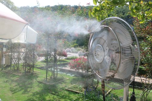 霧と霞の仲間のミスト扇風機もお客様の暑さ対策用に設置されておりますので、涼を感じて頂けたらと思います。