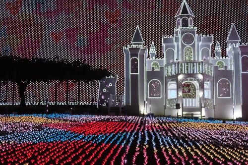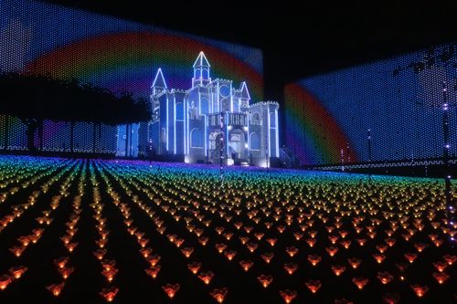 花と光に彩られた幻想的なお城。光の花火による演出に圧倒される事間違いなしです☻