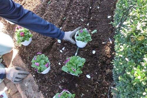 ここではビオラが主役! 一個一個株間を調整して並べていきます。