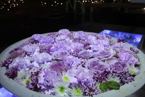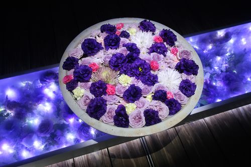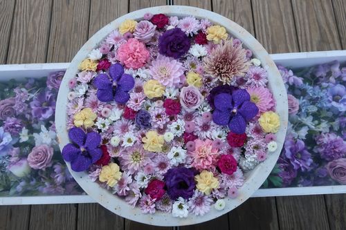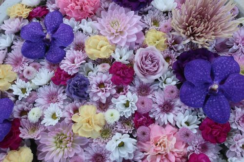 ピンク・紫を中心に、キク・バラ・ダリア・スプレイカーネーション・バンダなどが入っています。