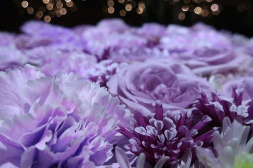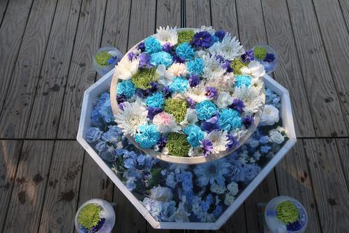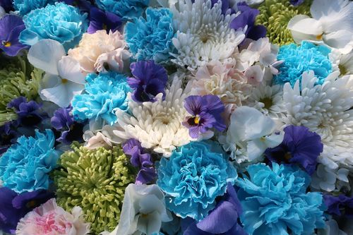 白・青系・緑を中心に、キク・カーネーション・パンジー・アジサイなどが入っています。