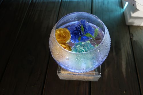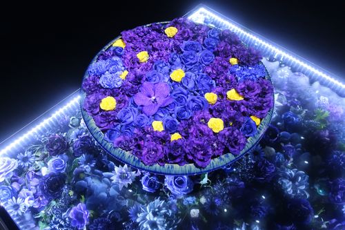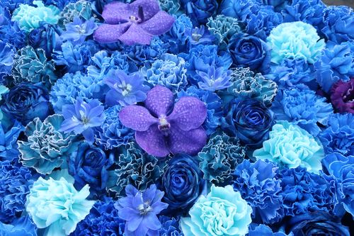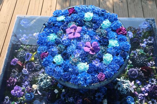 青を中心にカーネーション・バラ・デルフィニウム・トルコキキョウ・パンジーなどが入ってます。