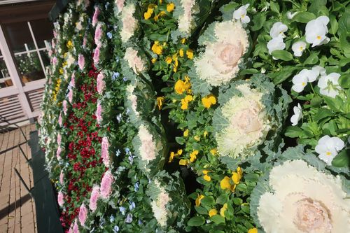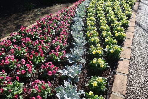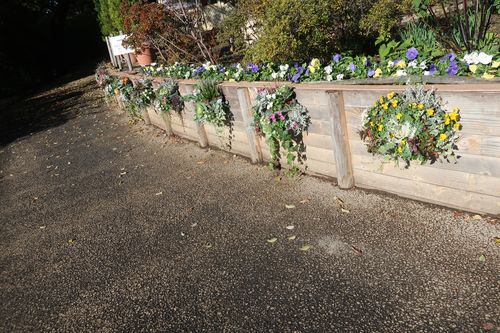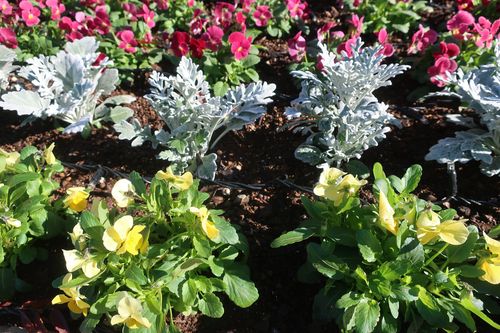 ↑新しく植栽したビオラとシロタエギクの花壇。