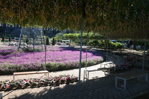 ↑アメジストセージと藤棚(フラワーステージ周辺)