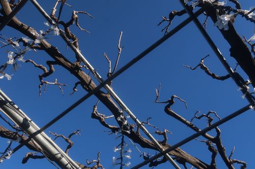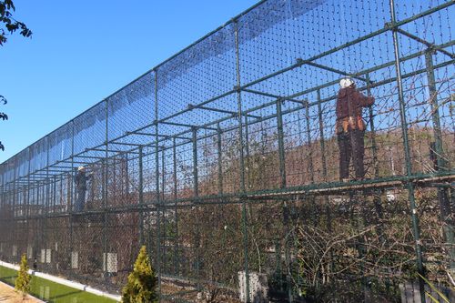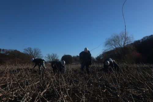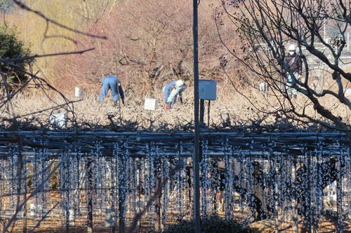 青空の下、樹木チームは今日も藤の冬剪定を行っていました。