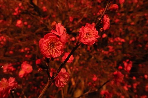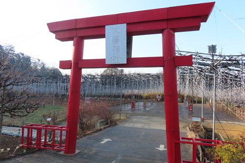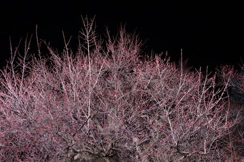 上の写真は奇蹟の大藤近くの寒紅梅です。ライトアップされ、幻想的な雰囲気となっています!