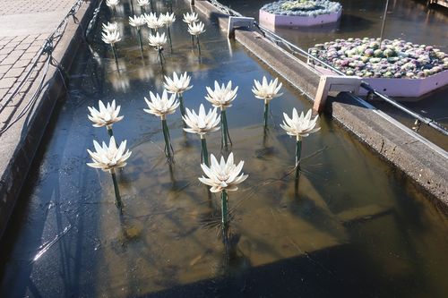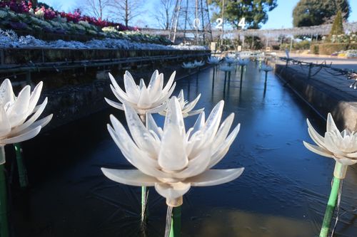 ↓池や水路だけでなく、植栽されている植物も凍って白くなっています。