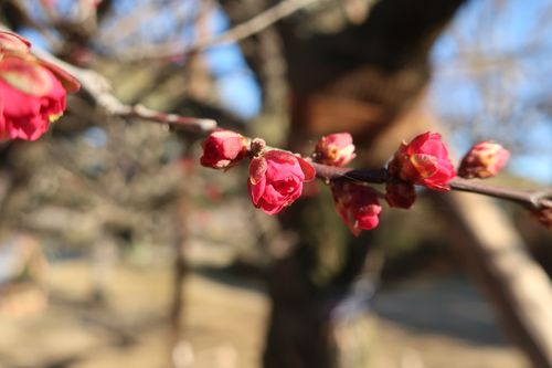 このシーンのように園内の梅も咲き始め、寒紅梅の一部は見頃を迎えています!