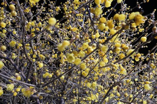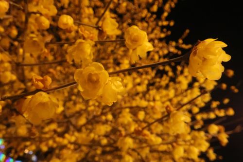 上の写真はオリジナルショップ1付近の様子です。厳密には梅ではありませんが、蝋梅も見頃を迎えており、イルミネーションに負けない存在感となっています!