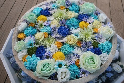 ここではバラ(水色・黄色) キク(白・緑・黄色・青・水色) カーネーション(黄色・青・水色)の