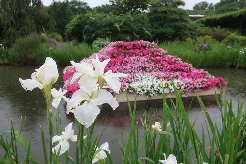 花菖蒲の白と奥のペチュニアのピンクが映えます。
