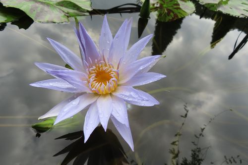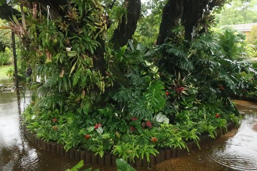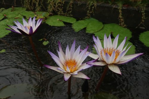 雨の中でもフラワーステージでは熱帯性スイレンがきれいに咲いていました。雨の日に花の写真を撮ると晴れの日とは違った印象になりますね。