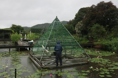 園内西側の池ではイルミネーション作品、光のピラミッドの電球取り付けをしているスタッフを発見。