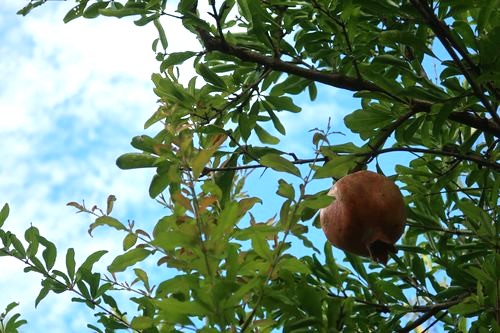 「ザクロの実」です。外見はごつごつしていますが、中には宝石の様な赤く美しい実がつまっています。