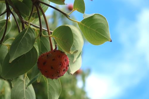 特徴的な見た目の「ヤマボウシの実」です。良く見るとボコボコと突起のある形です。