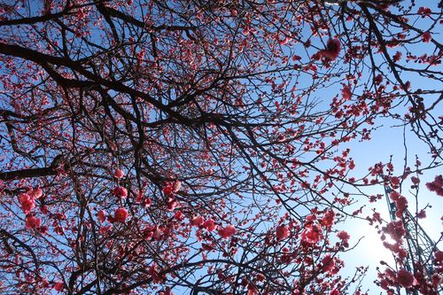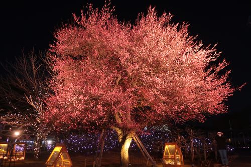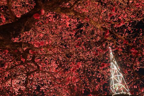 早咲きの梅「寒紅梅」 夜の空に鮮やかなピンクが浮かび上がります。